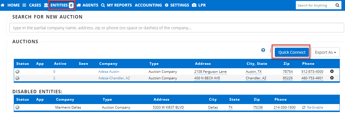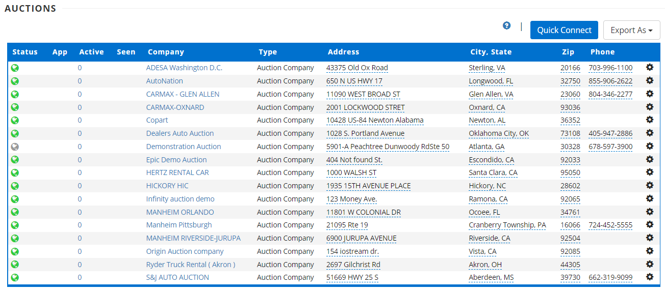 Step 3: Click on the Quick Connect button to add all the auctions, transport, or Police Agencies in a 50-mile radius of your coverage areas