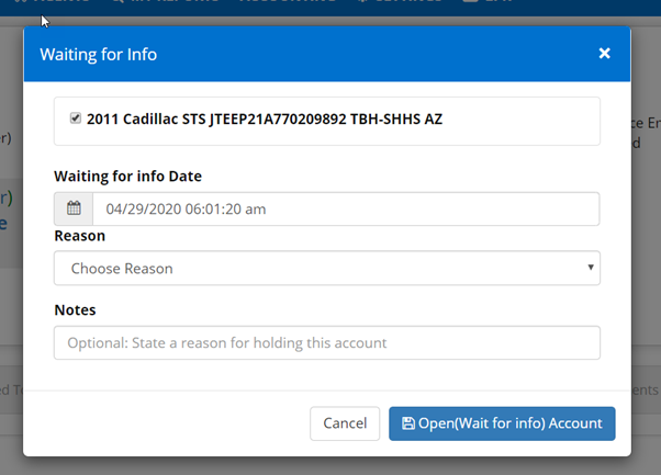 This action marks a case of Repossession Pending - On-Hook, meaning the collateral has been started the repossession process. The agency can quickly initiate the repossession of a case, without having to complete the full Asset Recovery form. On-Hook status prevents the case from being closed by a client or forwarder. This also allows the Repo Agent to arrive at a safe location to proceed to complete the Asset Recovery form and pictures.