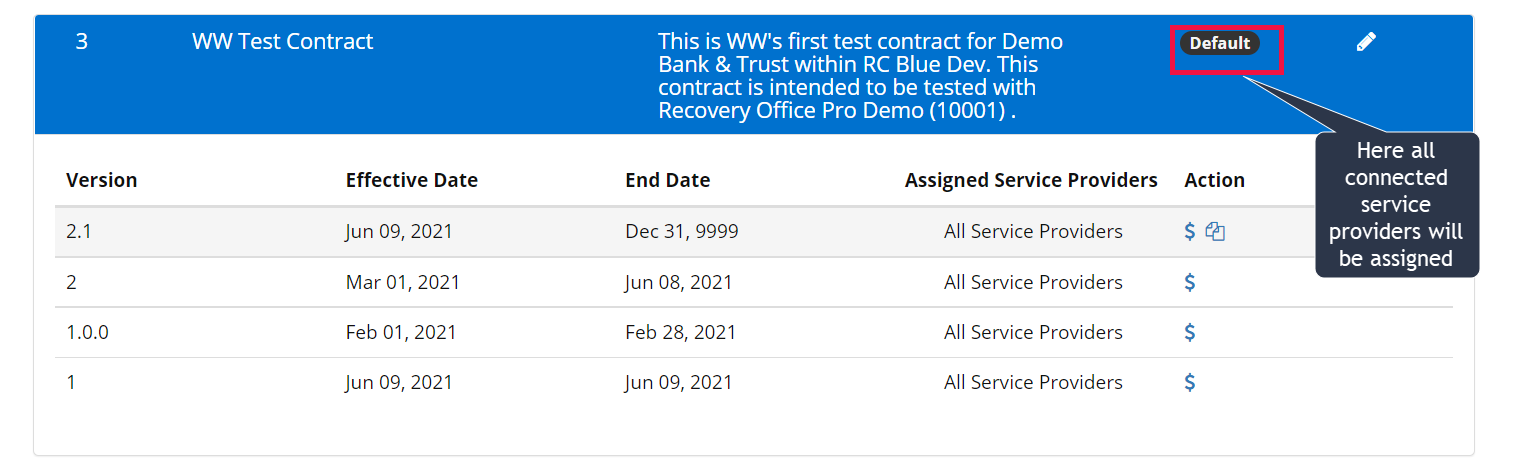 Note: There is a default setup where contracts are assigned to connected service providers in the company, if service providers are not assigned individually