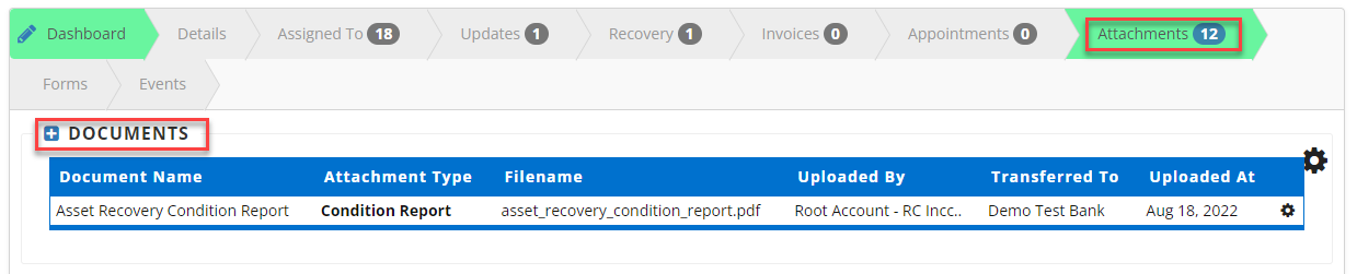 The attachments tab is where all the attachments for a case can be found. Attachments here can be attached during case creation, adding an address, during recovery of assets, and more.