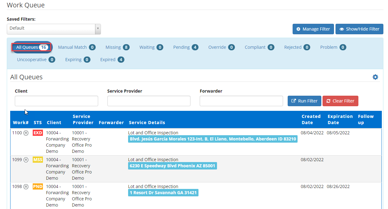 All Queues will display the number of service requests that have been created for your company.