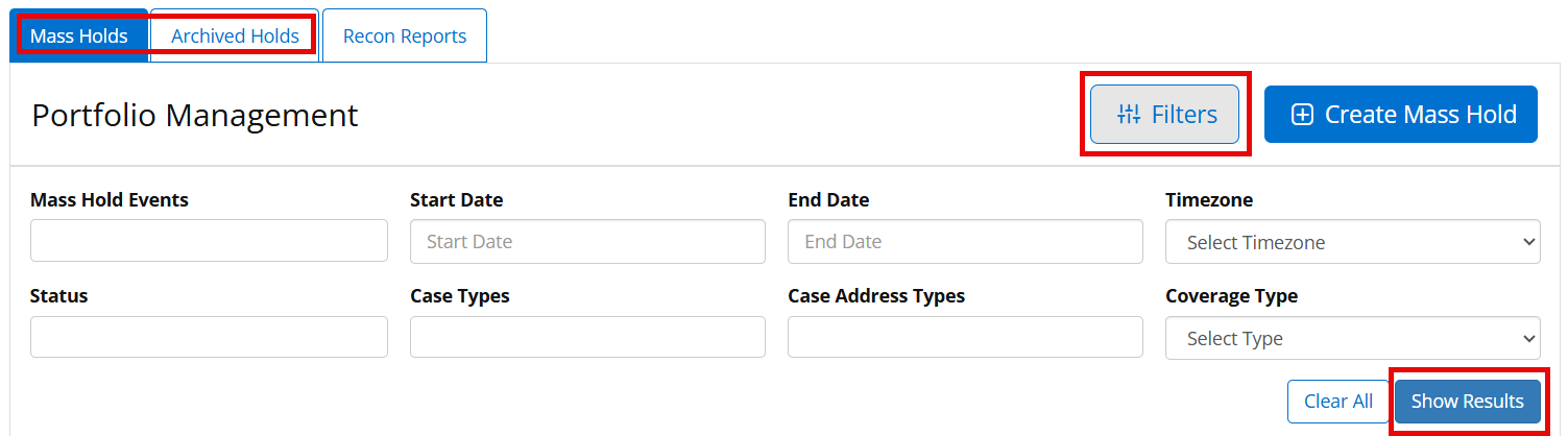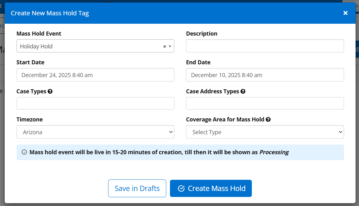 - Mass holds can be set by start and end dates, case types, and case addresses.