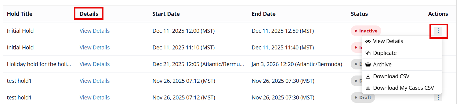 - Details - When the hold is in an Inactive or Scheduled status, you can view the details but not edit them; when the hold is in a draft status, you can make changes