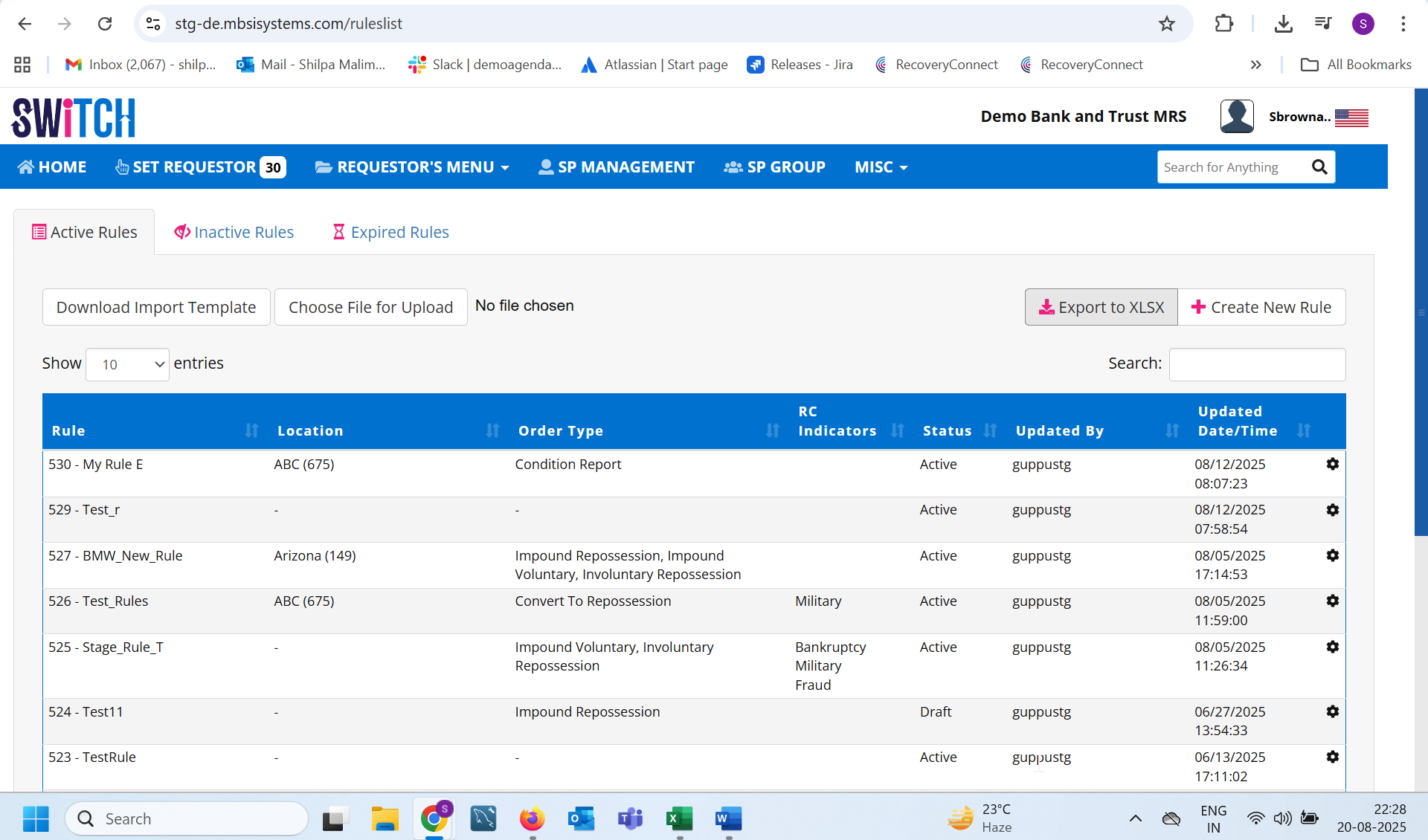 The system displays rules in a tabular format with columns: Rule, Location, Order Type, RC Indicators, Status, Updated By, and Updated Date/Time.