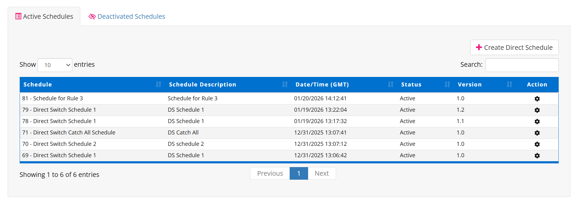 Actions (via gear icon) allow viewing or editing schedule details.